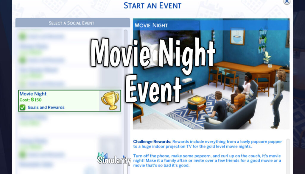 Ah, movie night; sitting down around the TV with popcorn and good people to watch a good (or sometimes so bad it’s good) movie or two while enjoying the company. Now your Sims can have their own movie night with this event at any residential lot. There are several relevant, themed goals to accomplish and cool prizes for a successful event. Please pay attention to the pack requirements furthe down on this page to make sure you are able to use this event without any missing parts! (If you’d rather go out to the movies rather than watch a movie at home, see my Out to the Movies Event.)